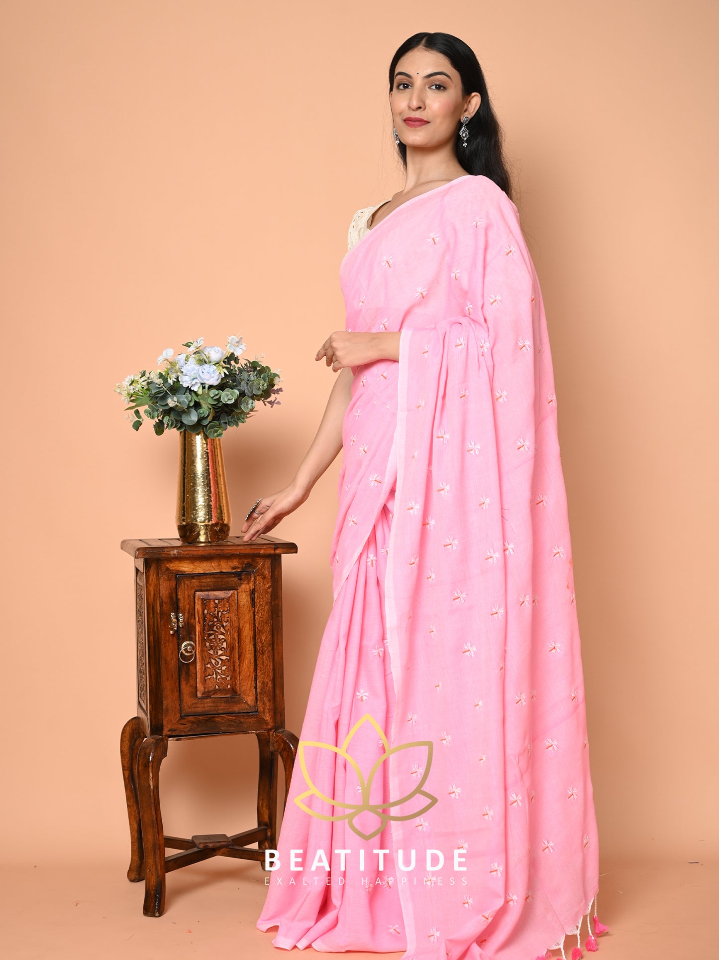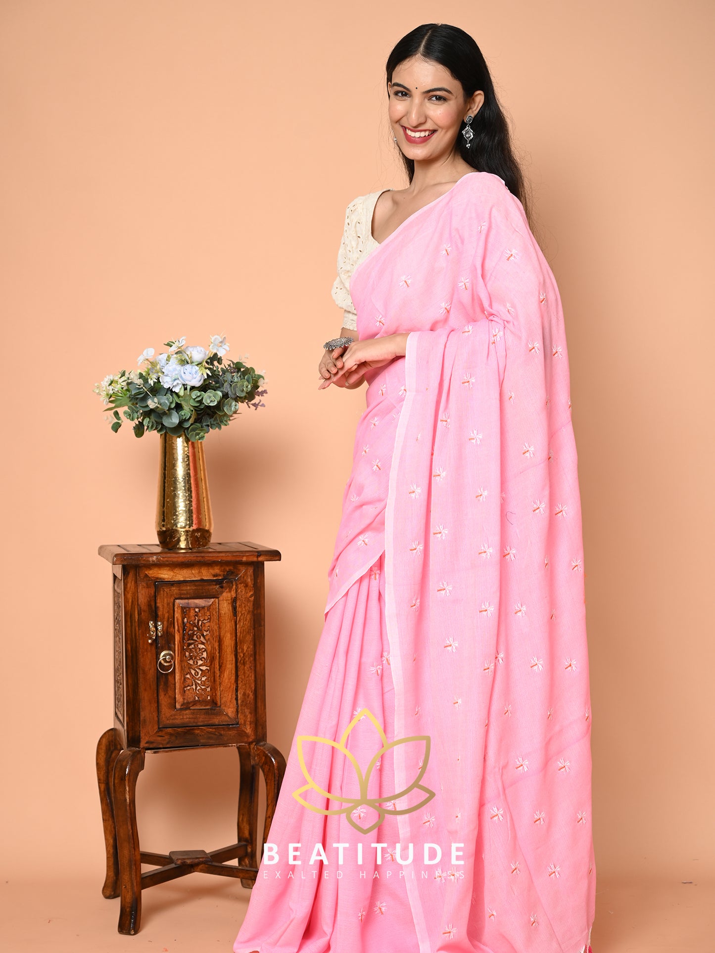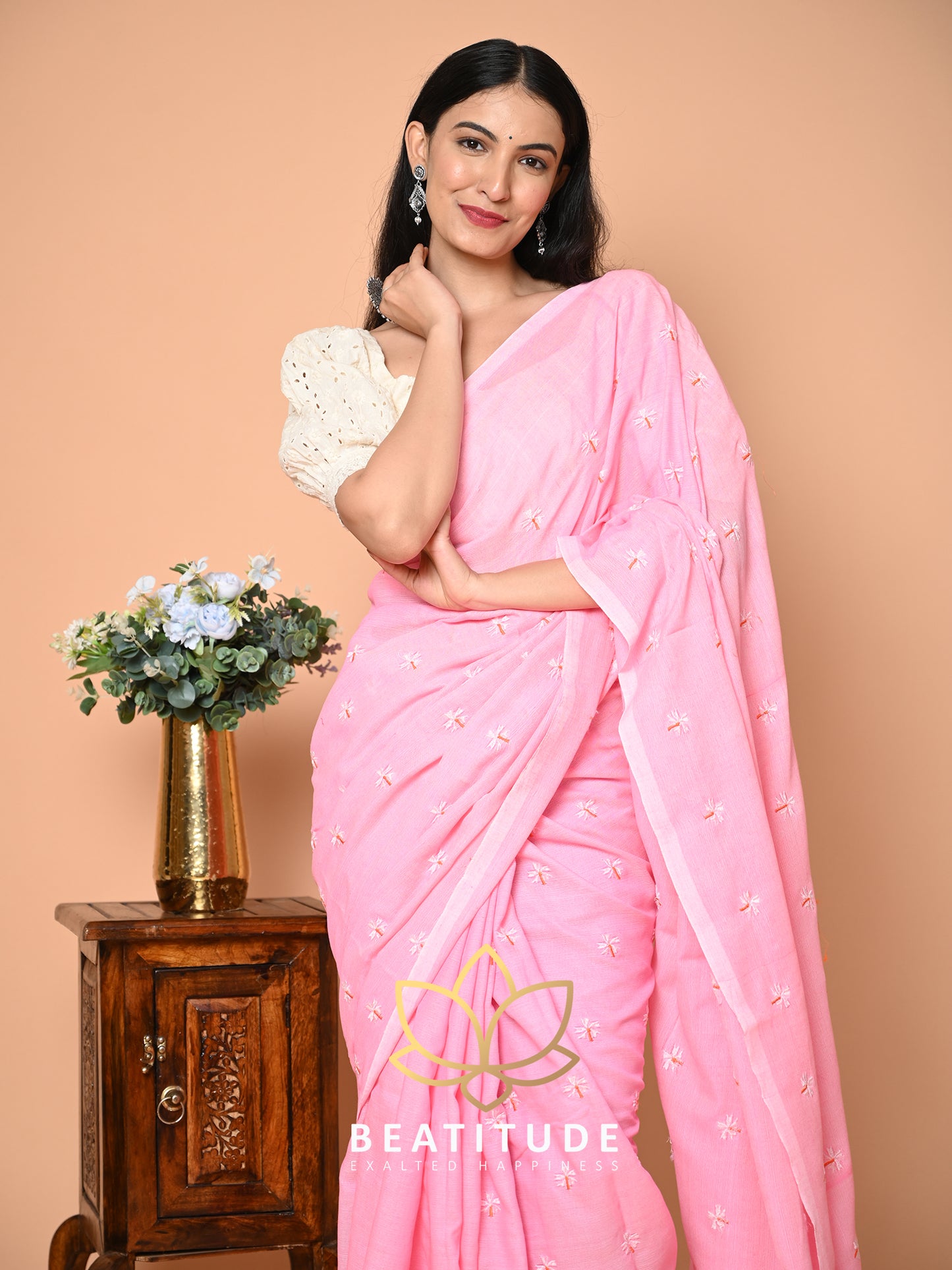 Pink Cotton Floral Embroidery Saree