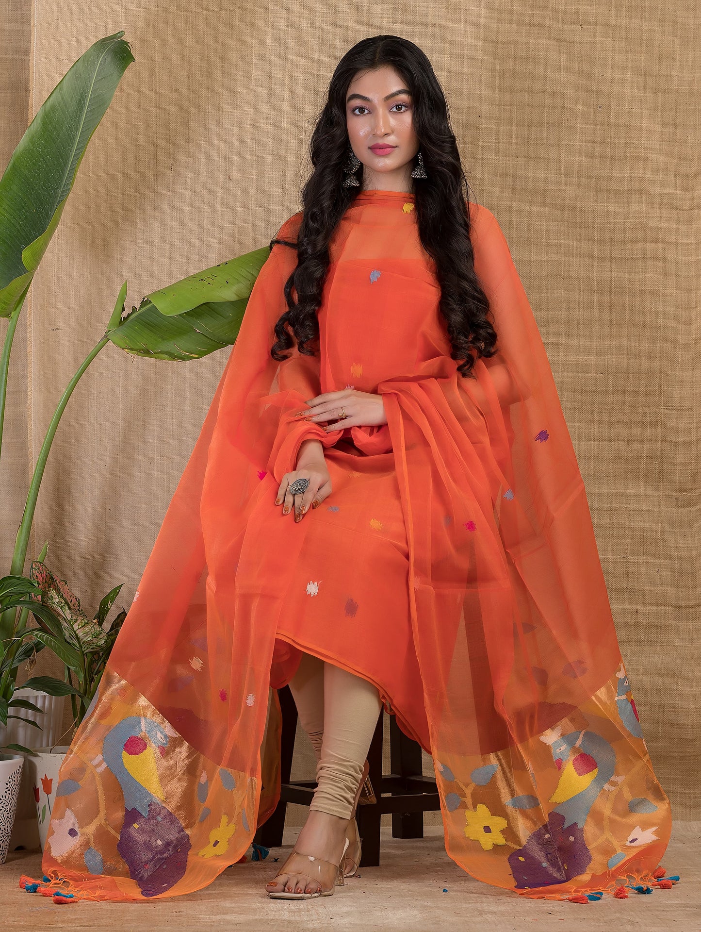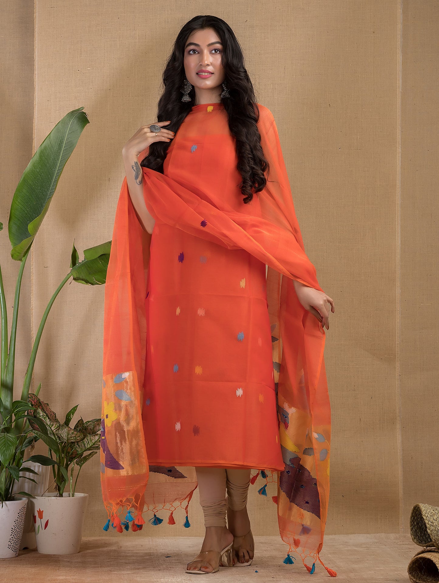 Add Orange Muslin Jamdani Paithani Top Dupatta( Un-Stitched ) to the cart