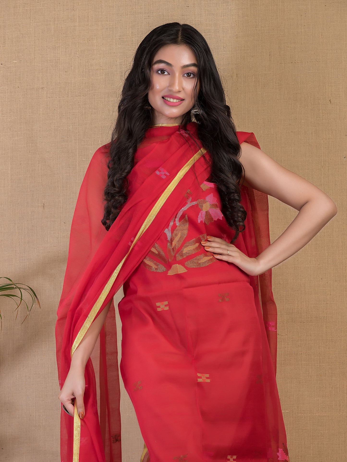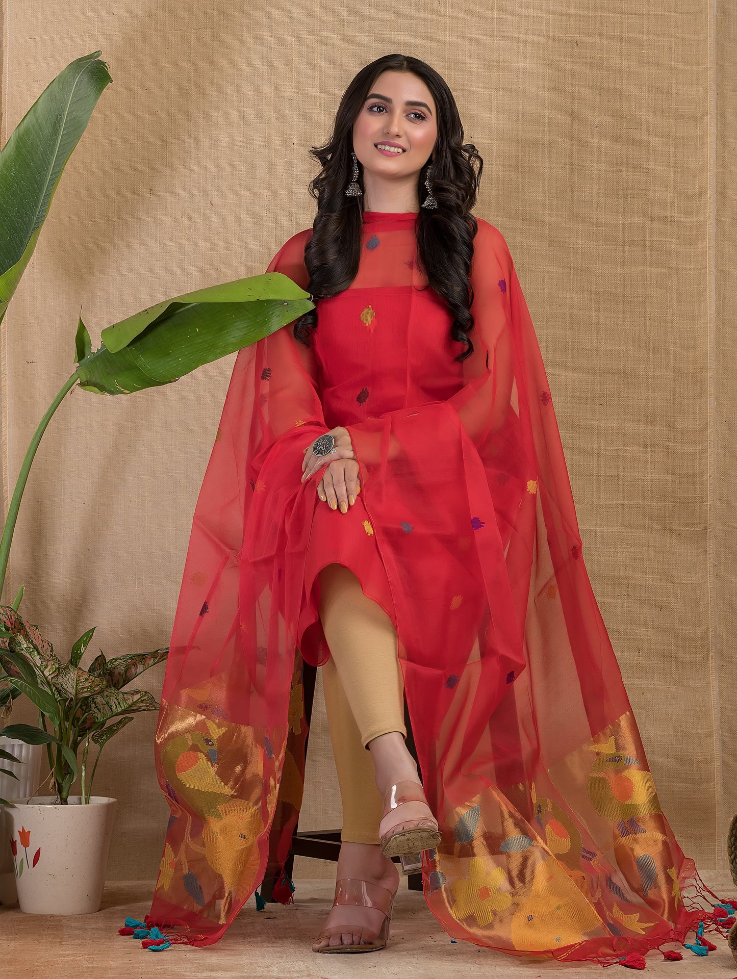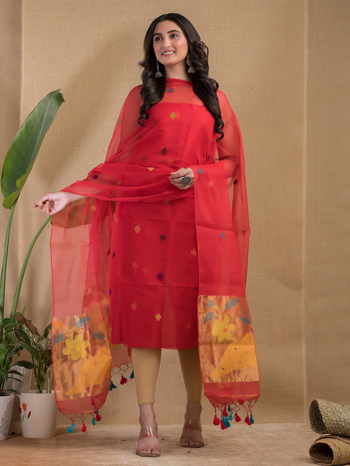 Add Red Muslin Jamdani Paithani Top Dupatta( Un-Stitched ) to the cart