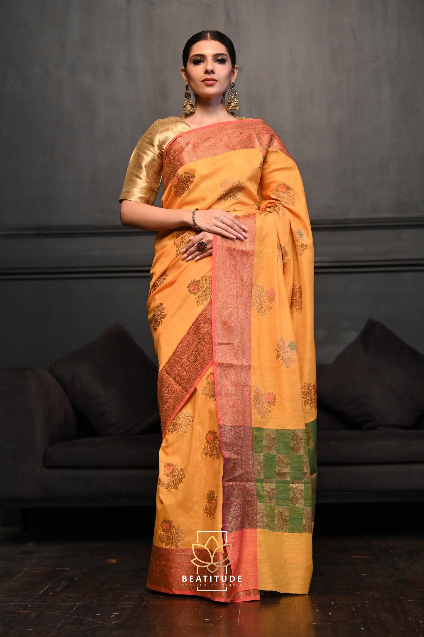 Add Mustard Handwoven Desi Tussar Banarasi Saree to the cart